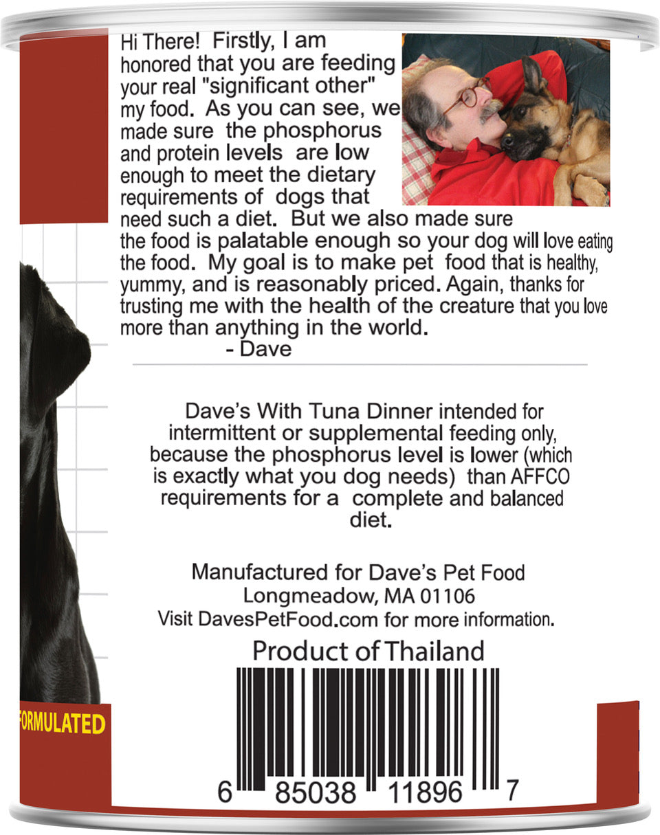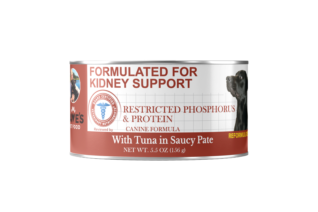 Dave's Canned Low Phosphorus Tuna Paté For Dogs was formulated by Board Certified Veterinarian Nutritionists and is a cost-effective solution to managing kidney disease. This low phosphorus, low protein formula helps protect your dog’s vital kidney function WITHOUT needing a prescription! It’s fortified with vitamins and minerals to help replenish those nutrients lost through increased urination, and the food is packed with paw-some flavor for palatability. It’s truly the perfect way to protect your dog's vital kidney function!