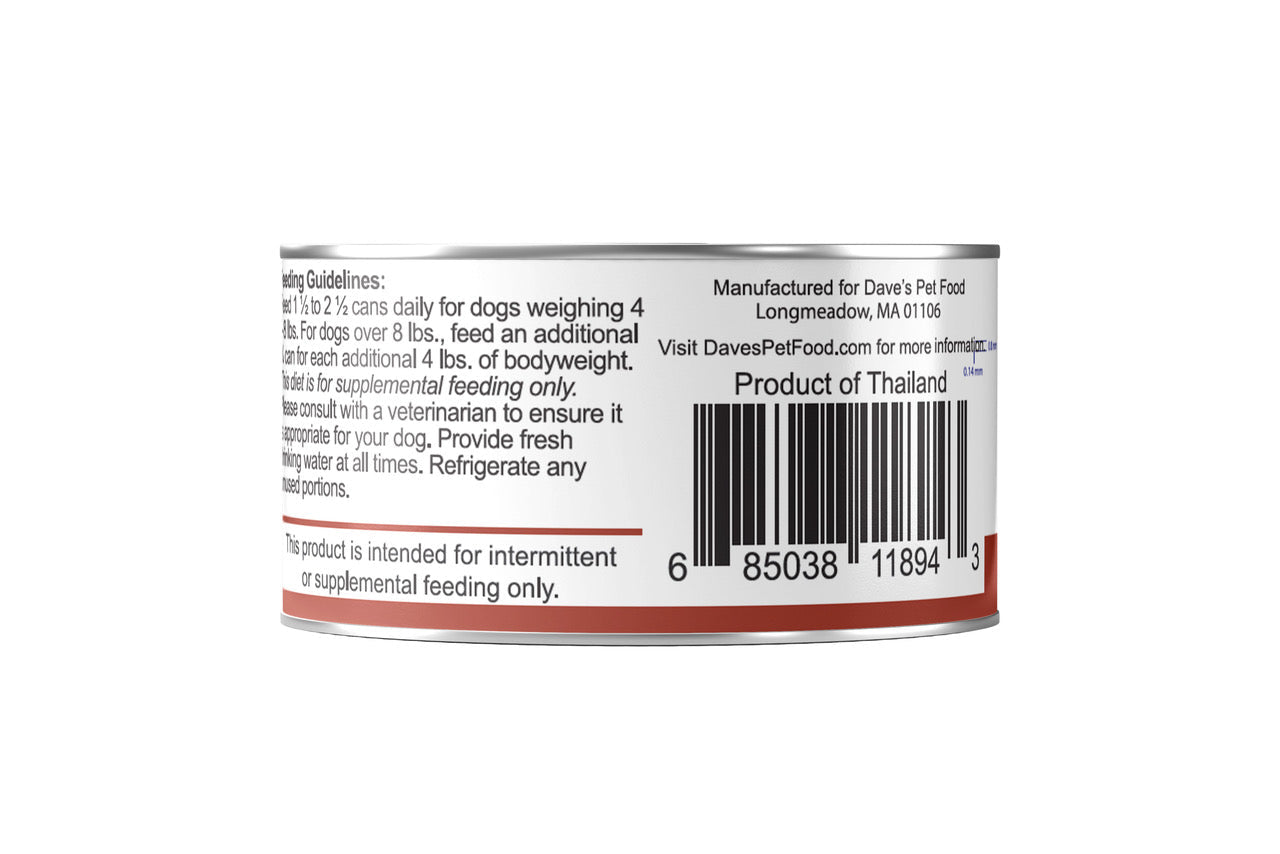 If you’d like more information about this recipe or would like to bring a can to your veterinarian for their opinion, please email us at office@davespetfood.com - we’d be happy to send you a free can.