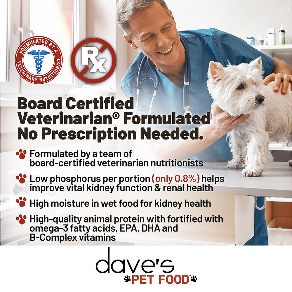 NO PRESCRIPTION NEEDED. FORMULATED BY BOARD CERTIFIED VETERINARIAN NUTRITIONISTS. Renal dog food formulated by a team of board-certified veterinarians and nutritionists to be low phosphorus to help manage kidney concerns.
