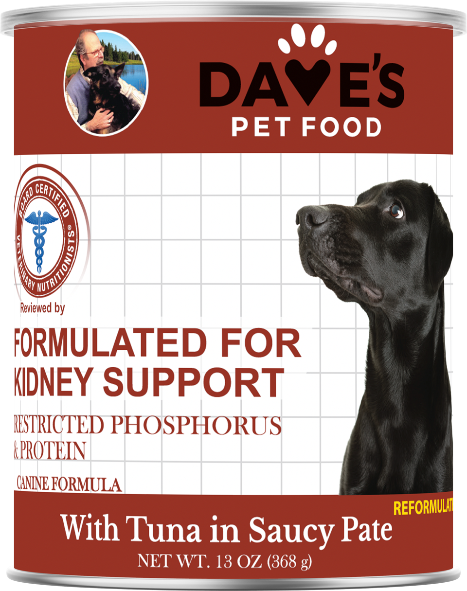 IRRESISTABLY TASTY WITH 17 ADDITIONAL VITAMINS & MINERALS. With Tuna Pate in gravy, your dog will love the taste of Dave’s dog food. Kidney care dog food wet is fortified omega-3 fatty acids, EPA, DHA, & B-complex vitamins to help replenish stores that are lost through increased urination.